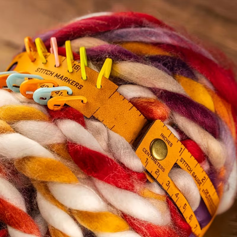 This clever 18-inch multifunctional tool keeps everything you need within arm's reach (literally). Sleek faux leather meets practical design: measure your gauge, check your hook sizes, and track your progress without ever losing your ruler in the couch cushions again.