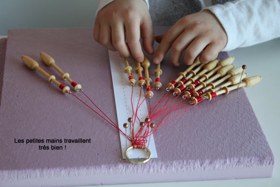 ✓ Prêt de l'équipement dentellier complet — coussin, fuseaux, fils, épingles, notes et patrons